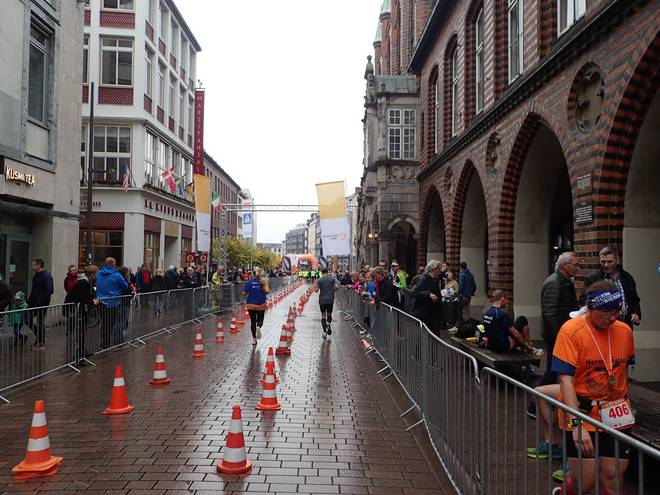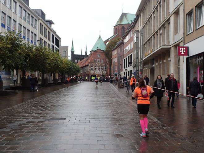 Breite Straße 14.18 Uhr / Km 42,0 Neben dem Rathaus gab es drei Spuren. Zwei davon für die Staffeln (hin und zurück) und die rechte für den Marathon. |