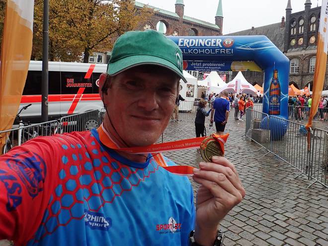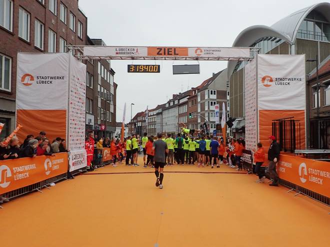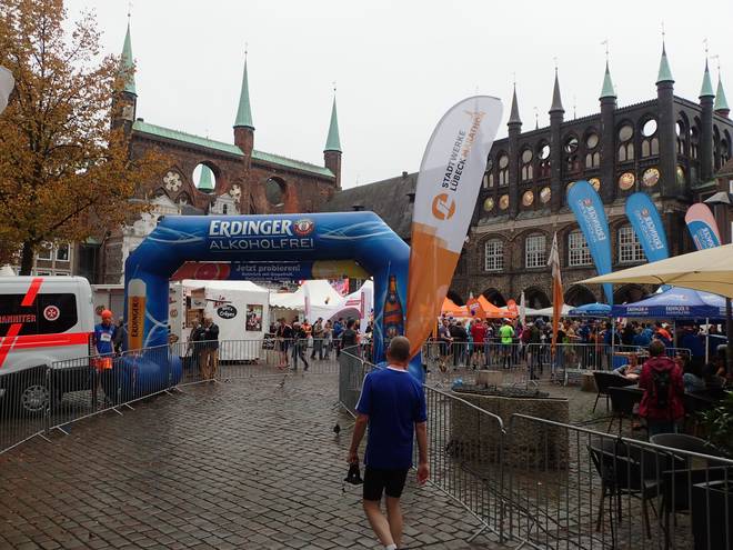 Kohlmarkt 14.19 Uhr / Km 42,185 Schon doof, wenn da Staffeln den Zieleinlauf blockieren und sich direkt hinter der Ziellinie feiern als wäre Lübeck nicht groß genug. So blieb dies das einzige Foto von meinem Zieleinlauf. Foto: Sportograf |