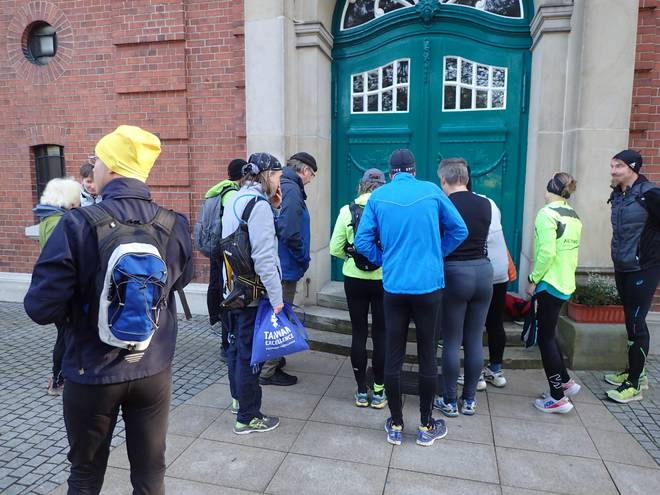 Lutherhöhe 9.56 Uhr Das winterlich bekleidete Teilnehmerfeld vor der Eingangstür der Lutherkirche. |