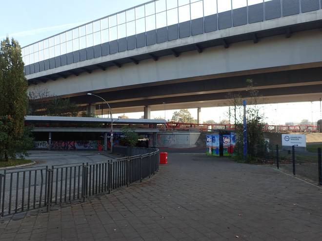 August-Kirch-Straße Altonaer Volkspark 10.12 Uhr / 1,7 Ich folgte stur dem GPS-Kurs, der mich hier allerdings in eine Sackgasse führte. Statt auf die Brücke nach Stellingen kam man hier unter die Brücke. Zu dumm, daß Internet-Karten nicht dreidimensional sind. Daß man oben herum auf die Brücke gelangt, war mir klar. Nur nicht, daß man es unten herum nicht kann. |