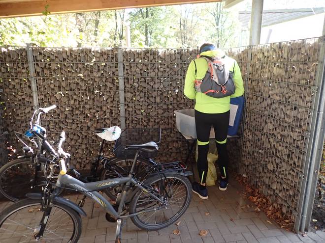 Osterkirche 11.53 Uhr / 18,1 Der Verpflegungsstand war in diesem Unterstand versteckt. Diesmal trank ich gleich drei Becher Cola. Bis zum dritten Verpflegungsstand waren es rund elf Kilometer. |