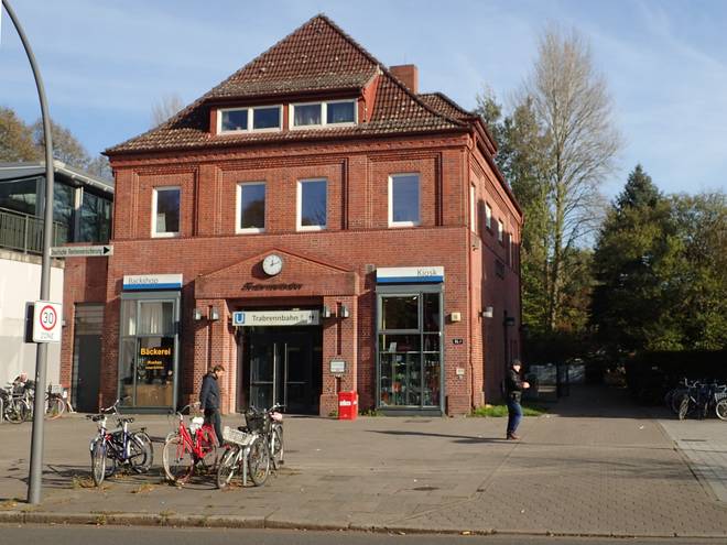 U-Bahn Trabrennbahn Traberweg 12.12 Uhr / 20,9 Wieder ein möglicher Extra-Verpflegungsstand. Aber auf solche Hilfen verzichtete ich. Das wäre dann eine Notfall-Lösung gewesen, aber dafür hatte ich zunächst noch etwas im Rucksack dabei. |