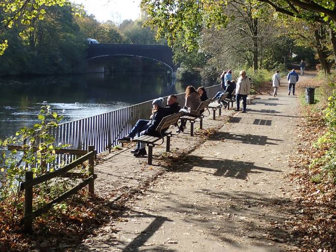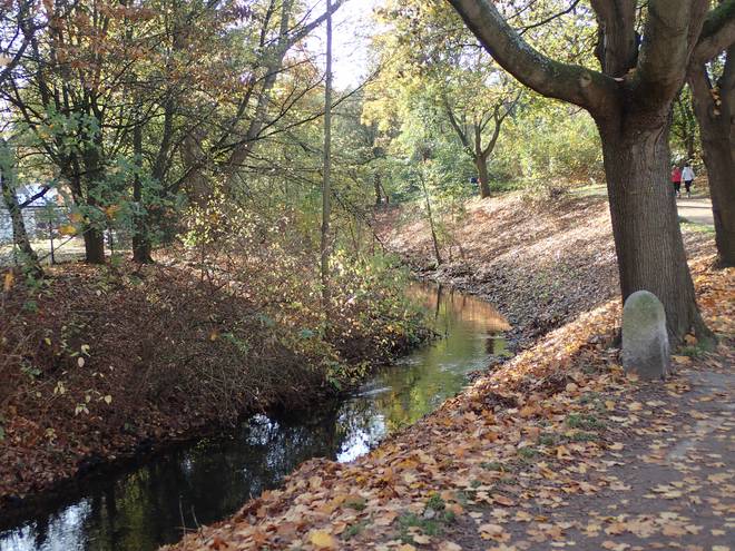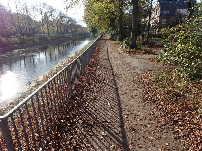 Eilbekkanal Eilbekkanalpark 12.53 Uhr / 27,7 Von der Außenalster in den Eilbek Park war ich schon gelaufen. Das war zwar länger her und in Gegenrichtung, aber ich wußte, daß es eine gerade Verbindung auf dieser Seite gab. |