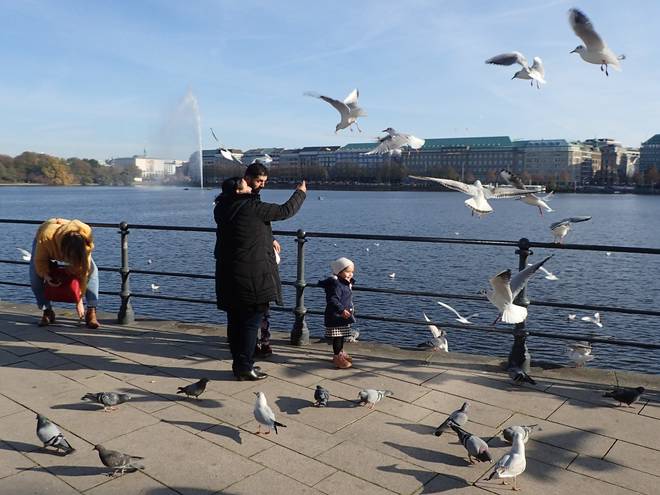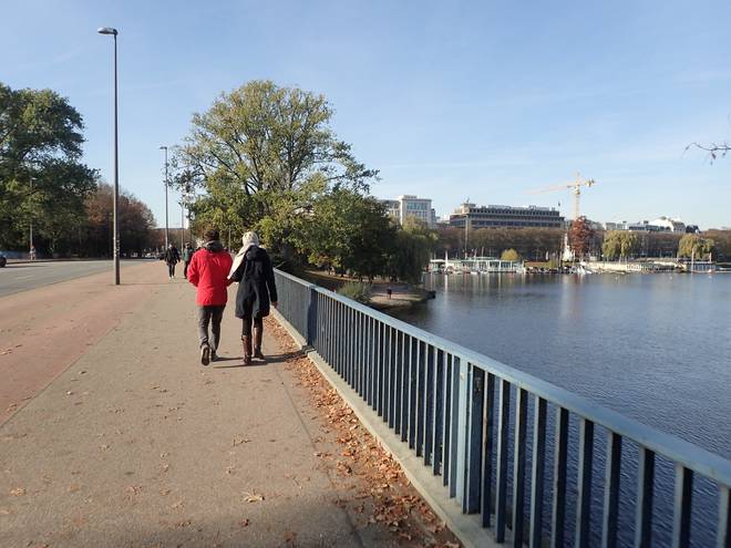 An der Alster 13.12 Uhr / 30,4 Wie an der Außenalster bei schönem Wetter üblich war es proppevoll. Nicht leicht, hier einen Weg zu finden. |