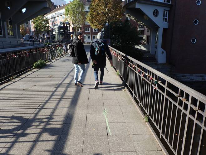 Michaelisbrücke 13.30 Uhr / 33,6 Das war aber nett. Die Beiden malten Pfeile auf die Brücke. Da konnte ich mich ja nicht mehr verlaufen. |