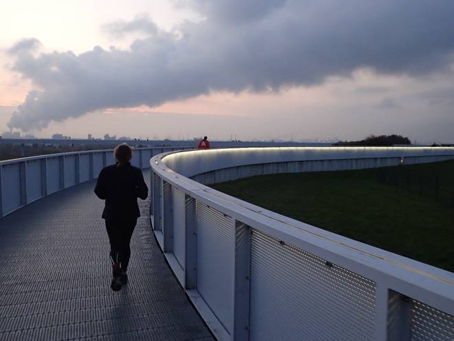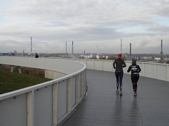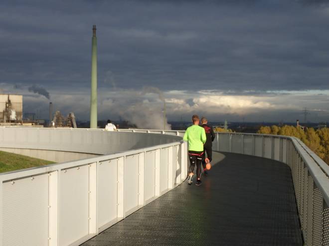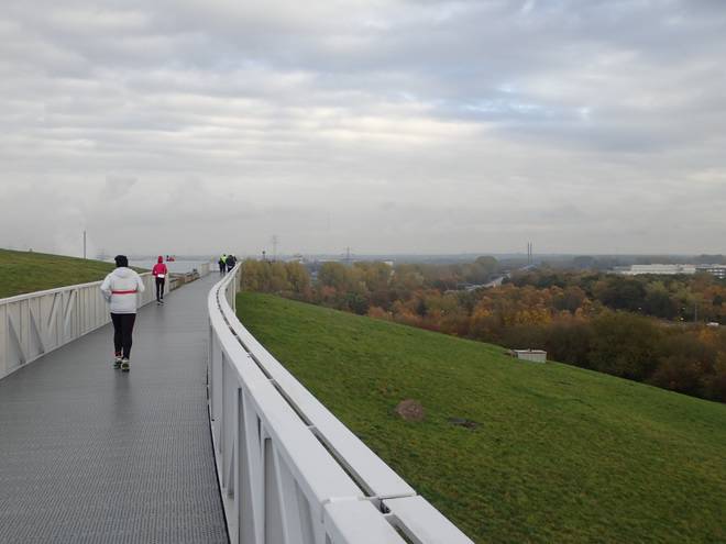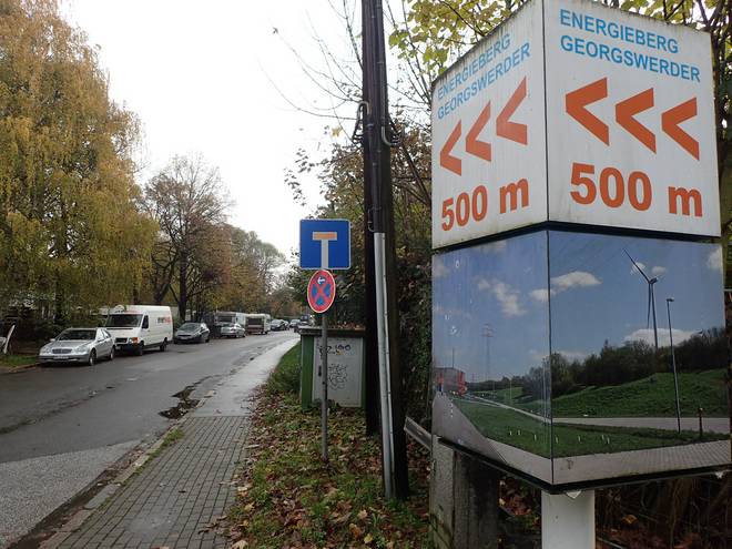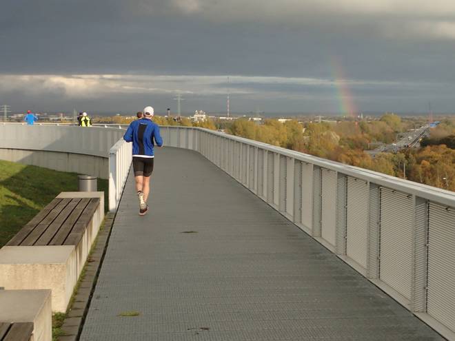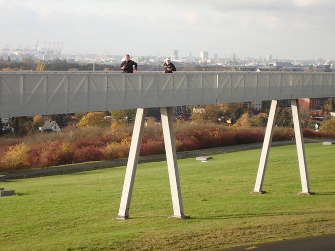 Energieberg Georgswerder 12.30 Uhr Der Energieberg war früher mal eine Mülldeponie. Oben drauf wurde ein Wanderweg gebaut. Die Runde ist 914,35 Metern lang und absolut flach. Dabei ist der Berlin-Marathon geradezu hochalpin. |