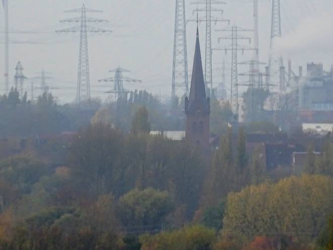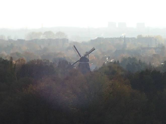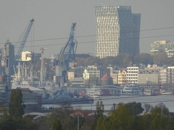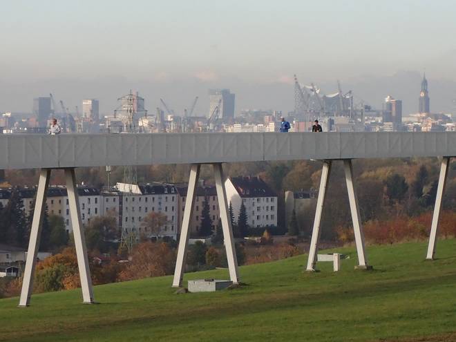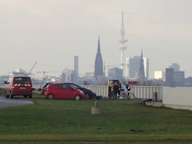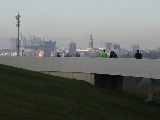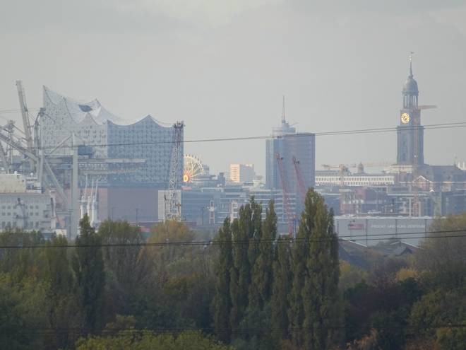 Energieberg Georgswerder 12.17 Uhr Links die Elbphilharmonie, daneben der Riesenrad vom Hamburger Dom und ganz rechts die Hauptkirche St. Michaelis. |
