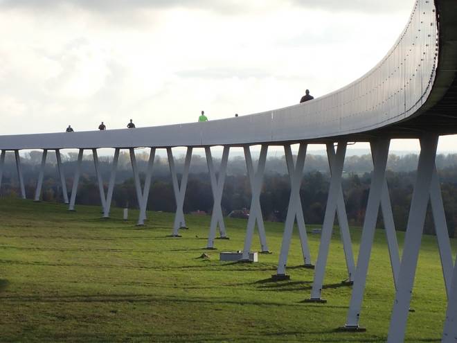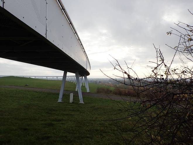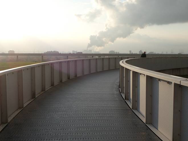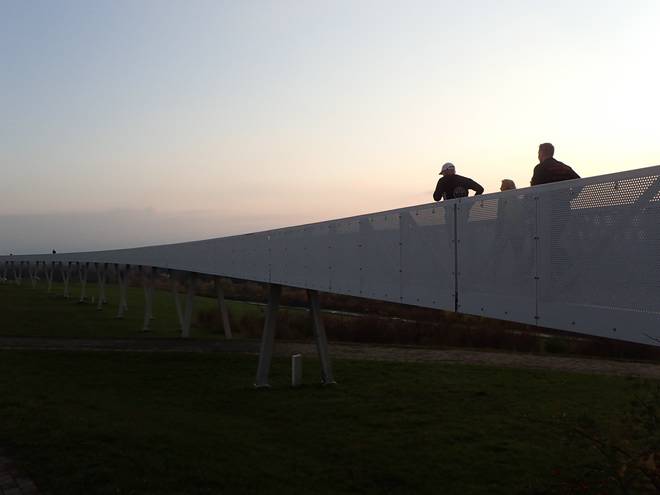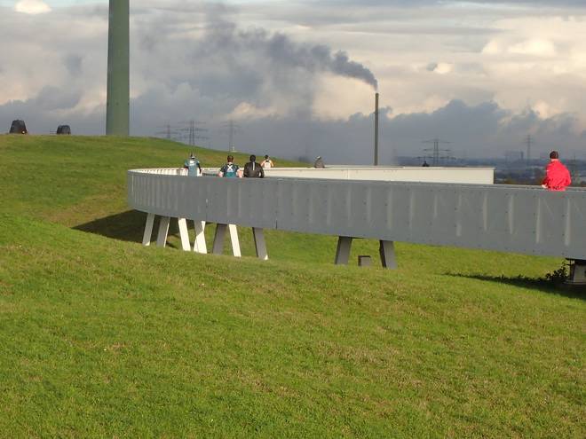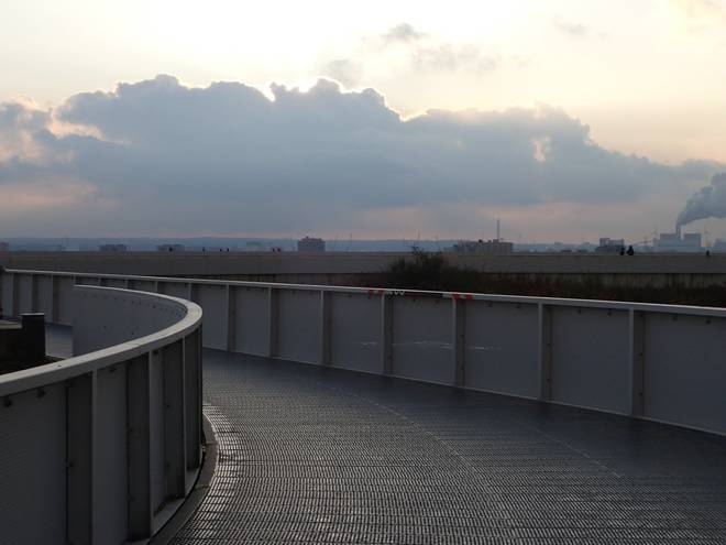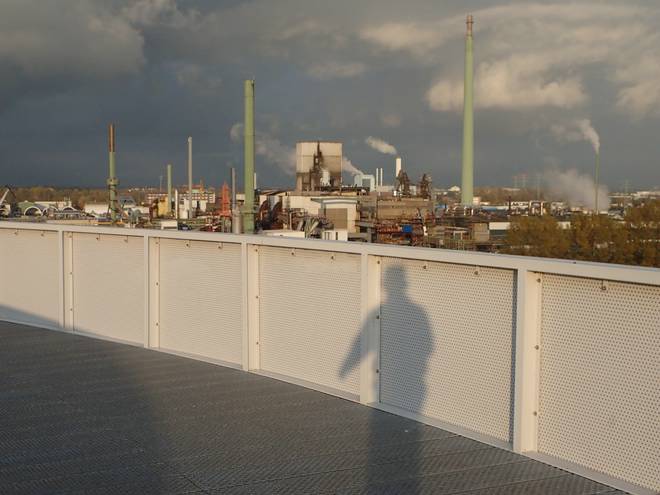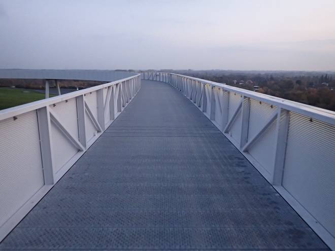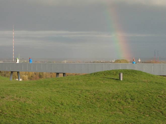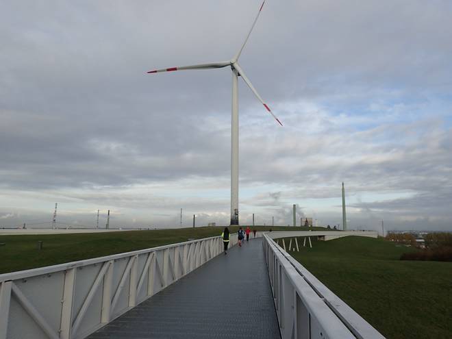 Energieberg Georgswerder 12.35 Uhr Allerdings ist man hier oben schutzlos den Naturgewalten ausgesetzt. Und die Metall-Platten, auf den man läuft, gefallen nicht jedem. Teils federn die durch. |