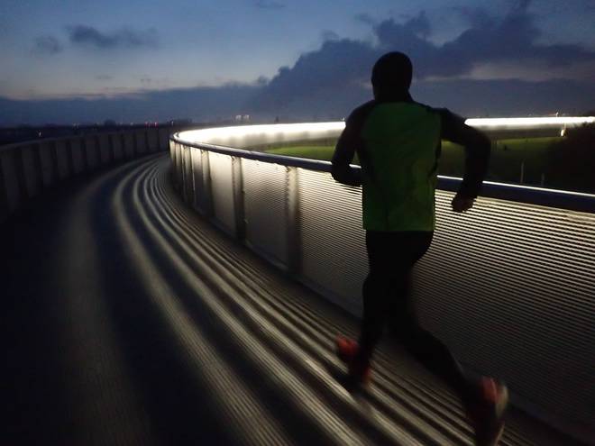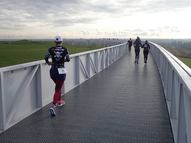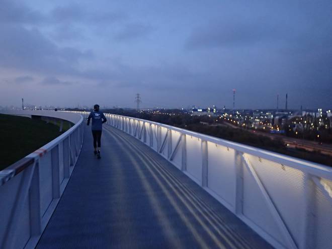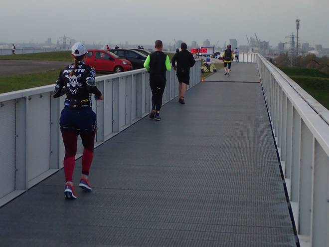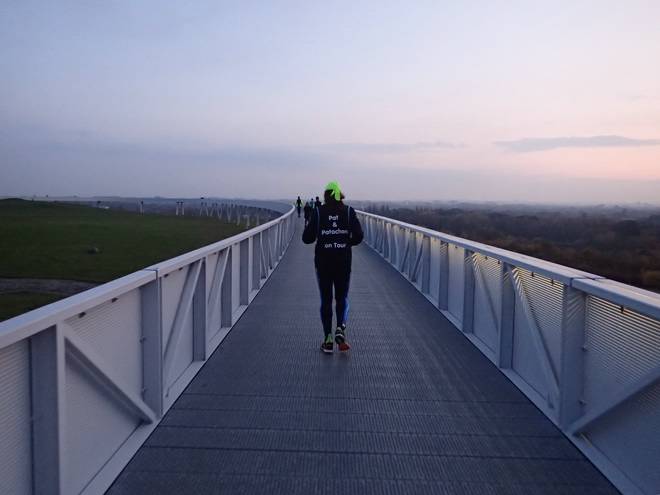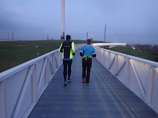 Runde 36 16.41 Uhr / Km 32,9 Hier hatte ich sie zwar dann eingeholt, aber es war doch zu dunkel geworden. Für Läufer-Fotos braucht es mehr Licht. Oder ein ruhige Hand, die ich nach 33 Kilometern nicht mehr habe. |