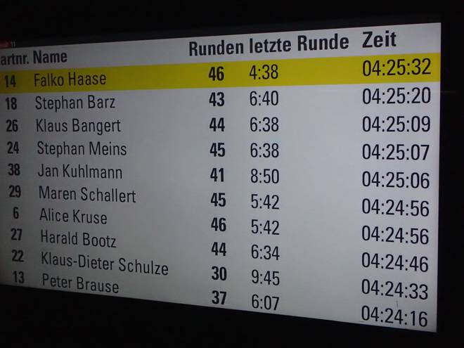 Runde 23 15.23 Uhr / Km 21,0975 2:15:57 Stunden dann an der Halbmarathon-Marke. |