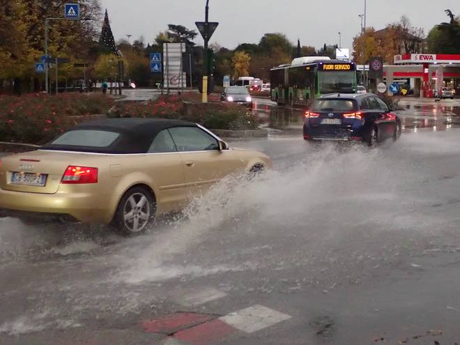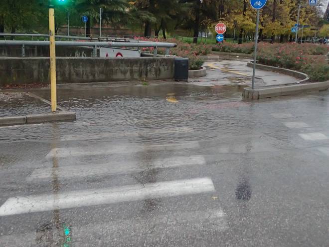 Via Franco Faccio 7.58 Uhr Das konnte lustig werden. Die Straßen standen jetzt schon teilweise unter Wasser. |