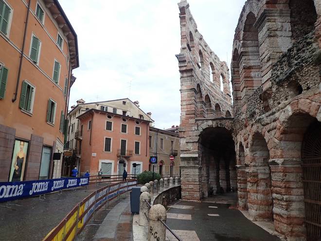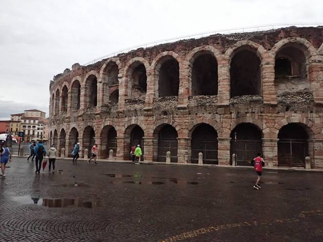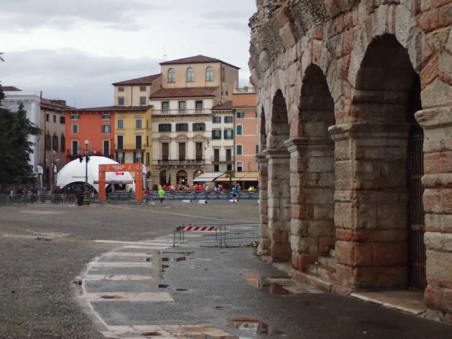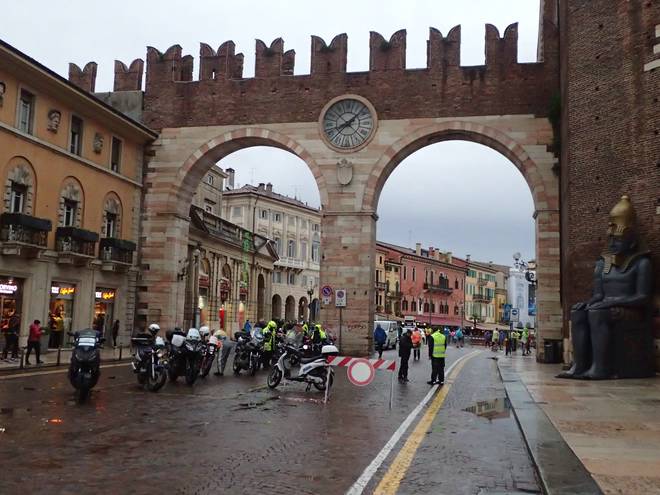 Largo Divisione Pasubio Mura comunali di Verona 8.38 Uhr Beim Sightseeing am Samstag am Gardasee und in Verona waren die Wunden sicherlich nicht besser geworden und nun tat immer noch alles weh. Und das vor dem Start. |