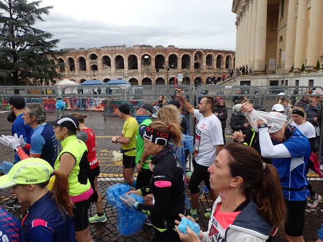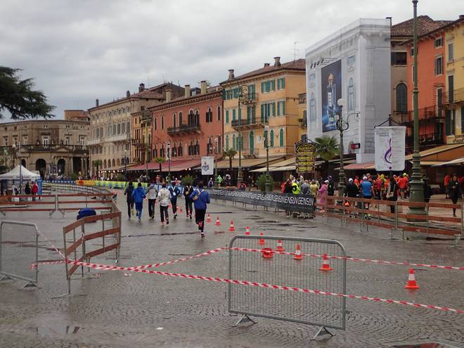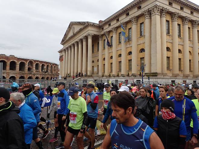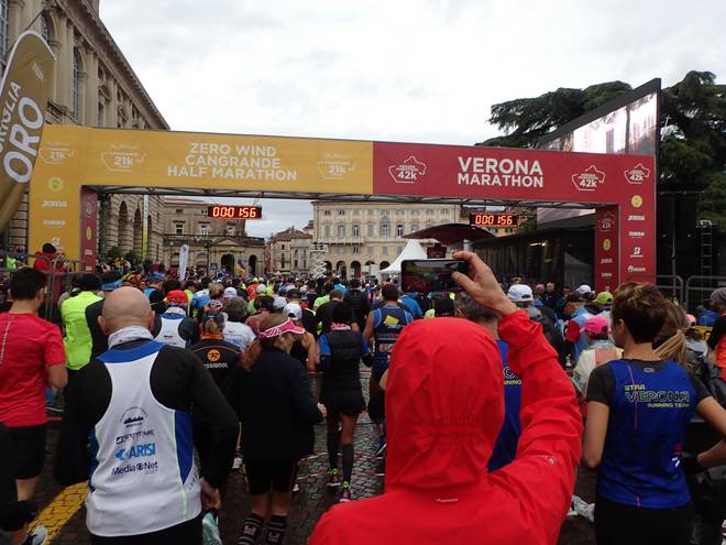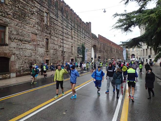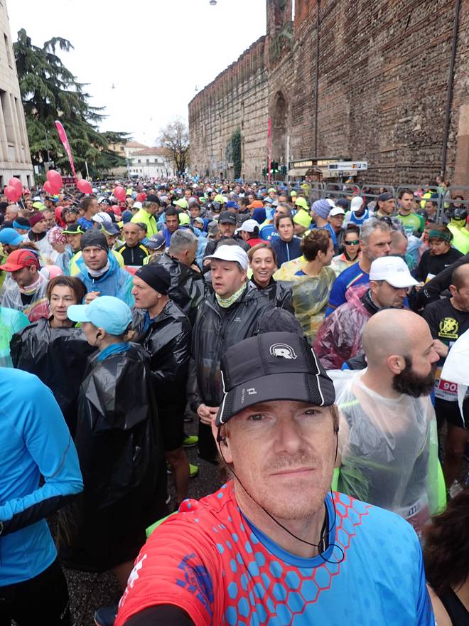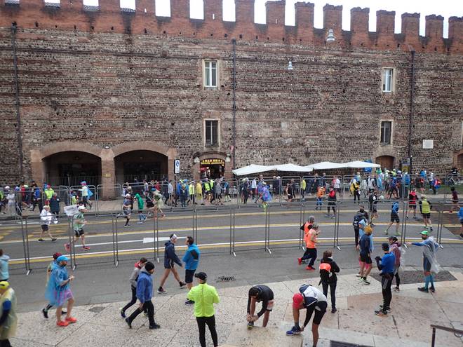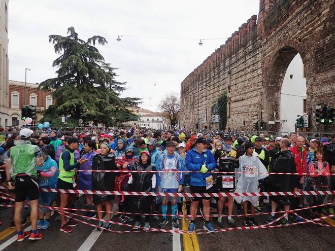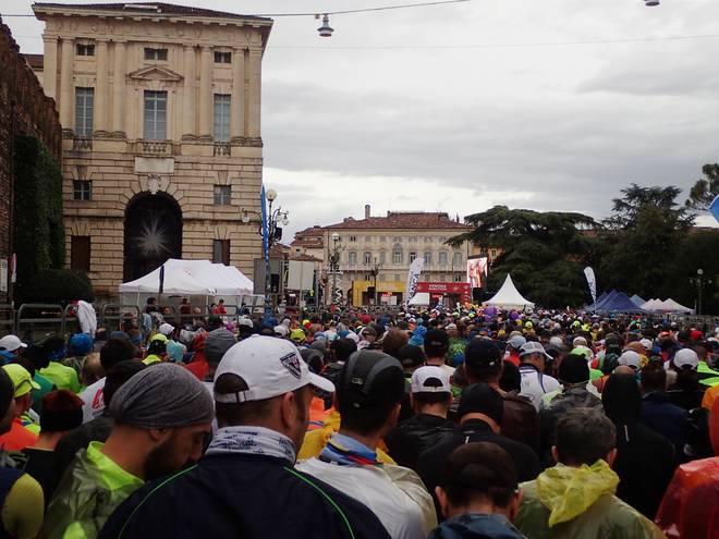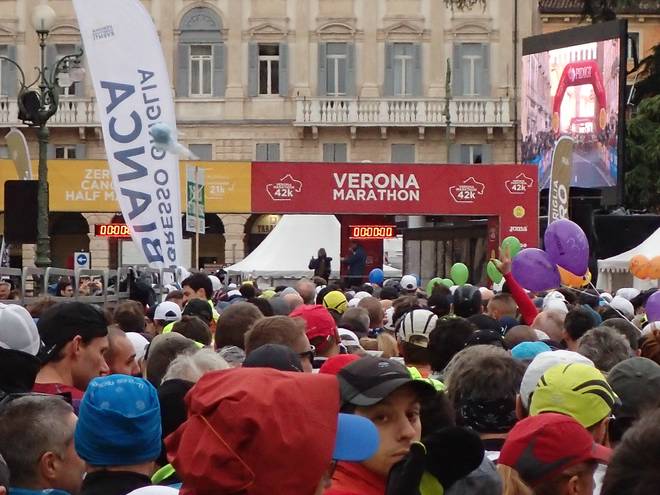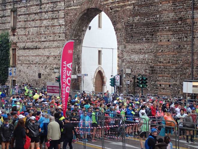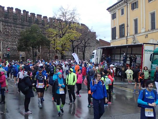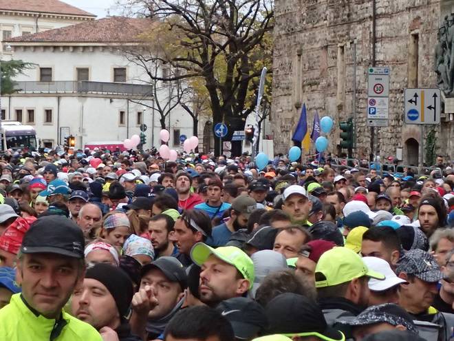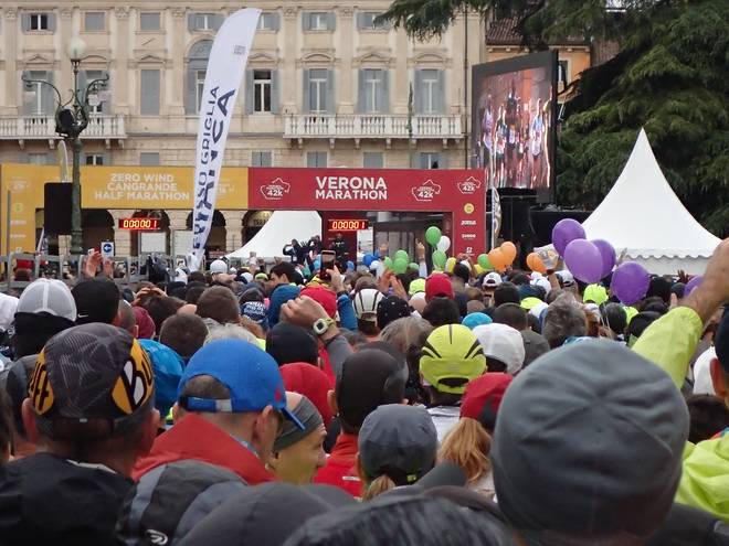 Largo Divisione Pasubio Mura comunali di Verona 8.59 Uhr 2543 Marathon-Läufer hatten sich angemeldet, 2014 davon kamen an den Start. Am Start auch noch 2752 Halbmarathon-Läufer (von 3292). Das ergab ein stattliche Starterfeld. |