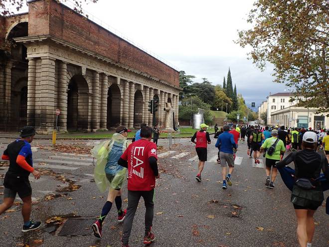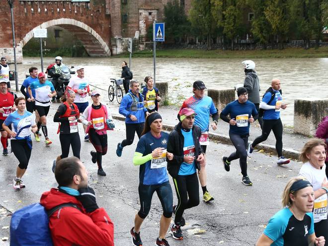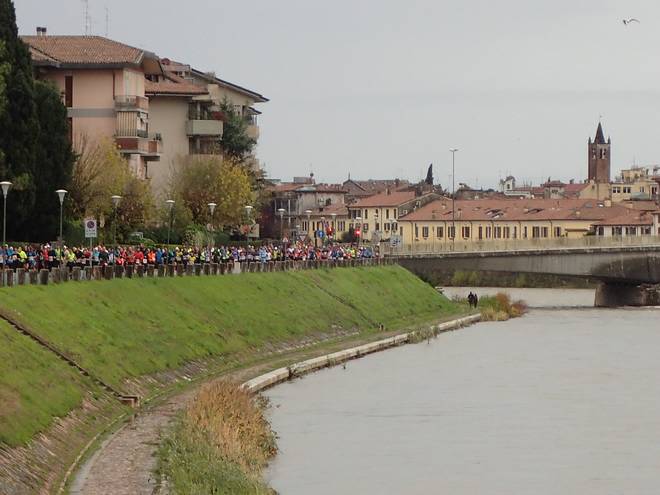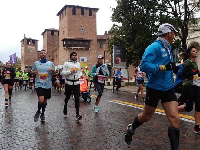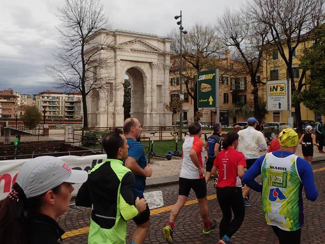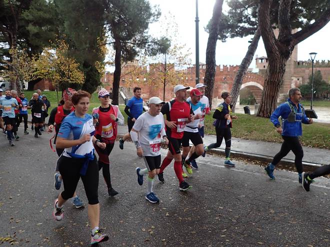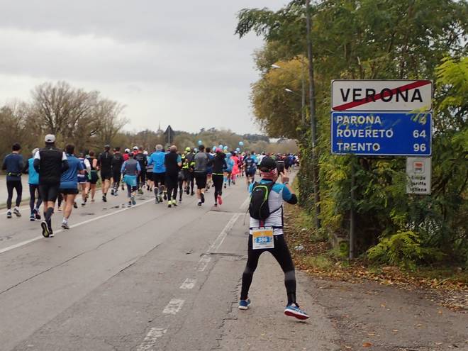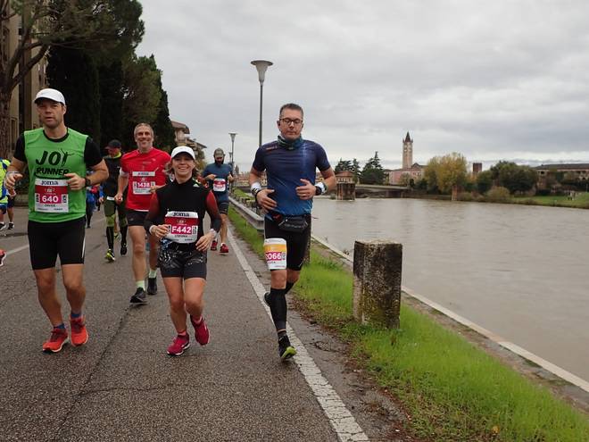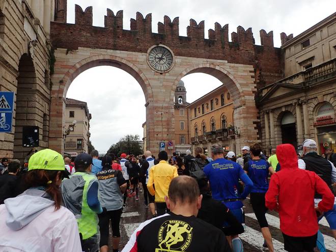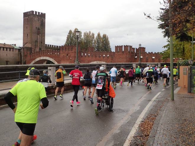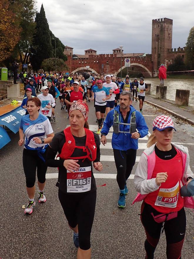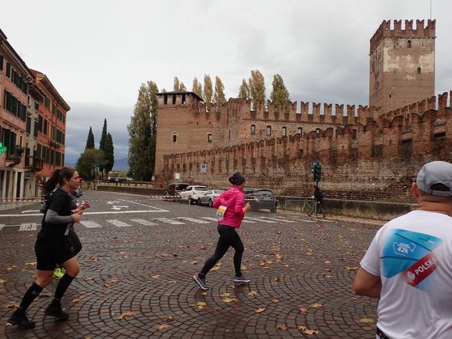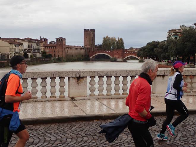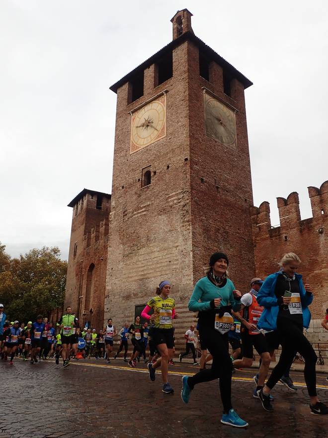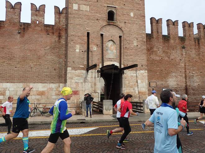 Lungadige Cangrande Ponte di Castelvecchio (Ponte Scaligero) Adige 9.26 Uhr / Km 3,4 Ich hatte mir das Shirt vom Bremen-Marathon 2019 für diesen Lauf ausgesucht. Die 3:46:41 Stunden würde ich sicherlich nicht wiederholen, aber Werbung für den Lauf mache ich immer gerne. Foto: Pica Technology |
