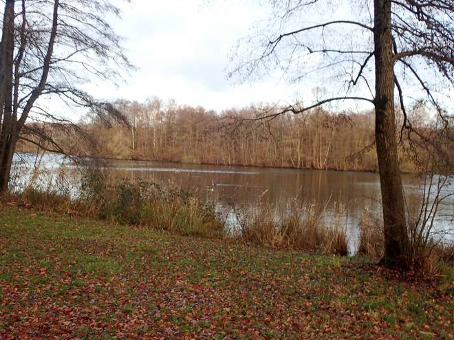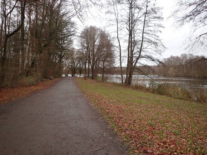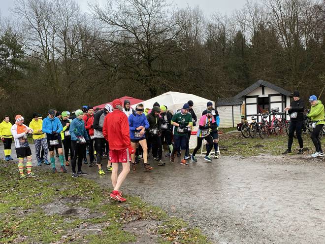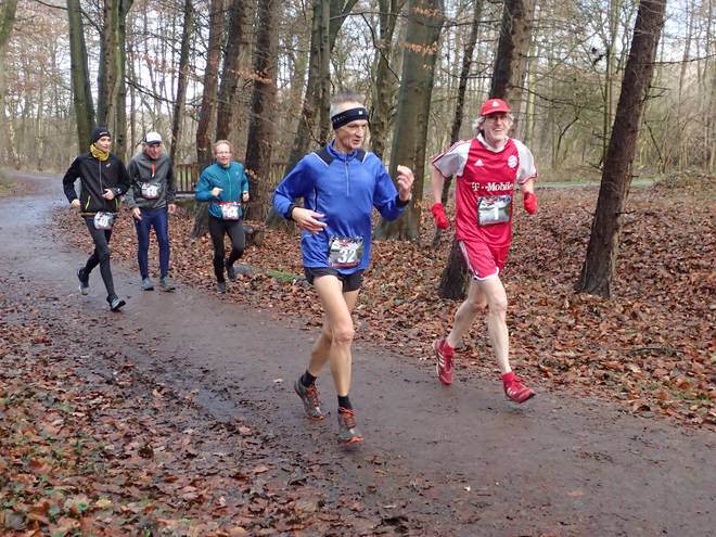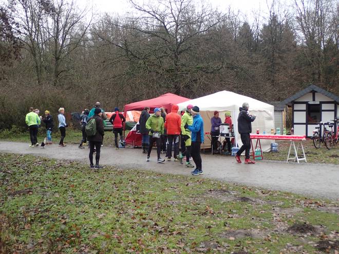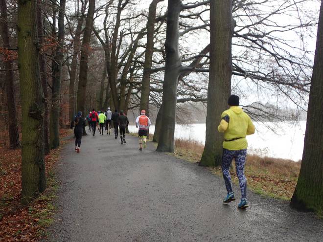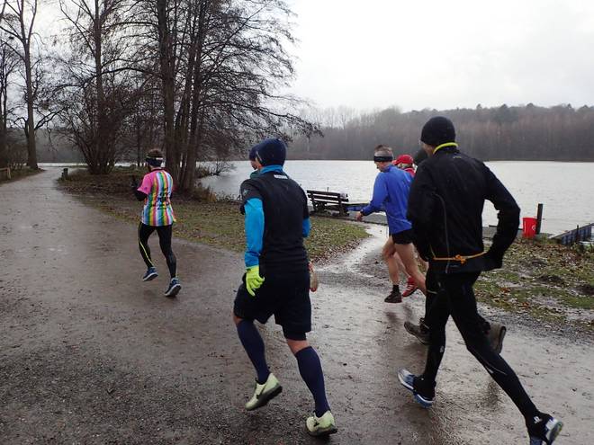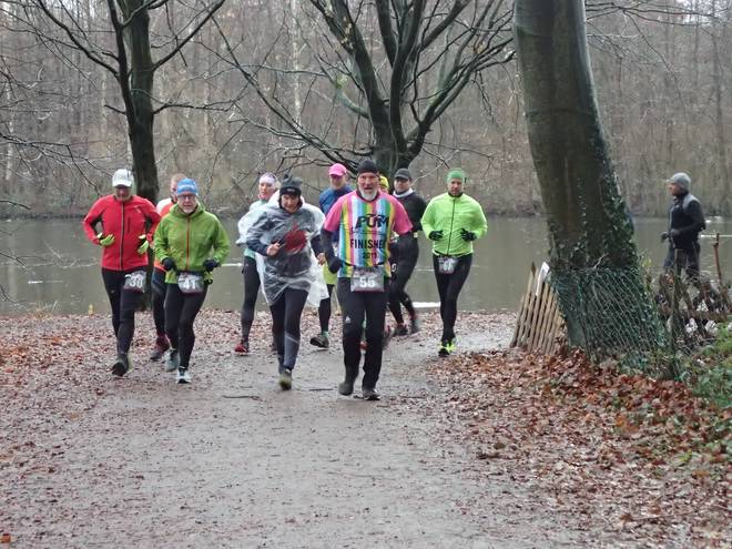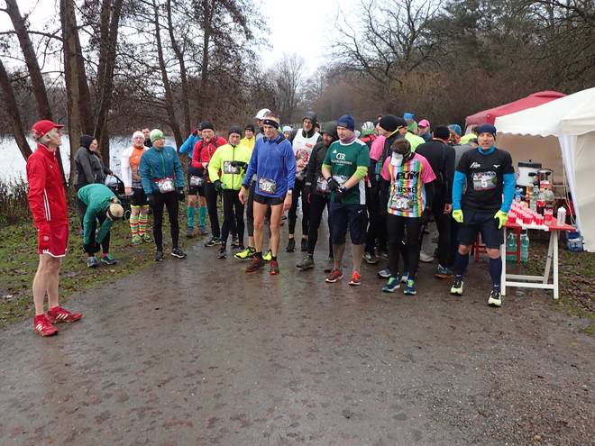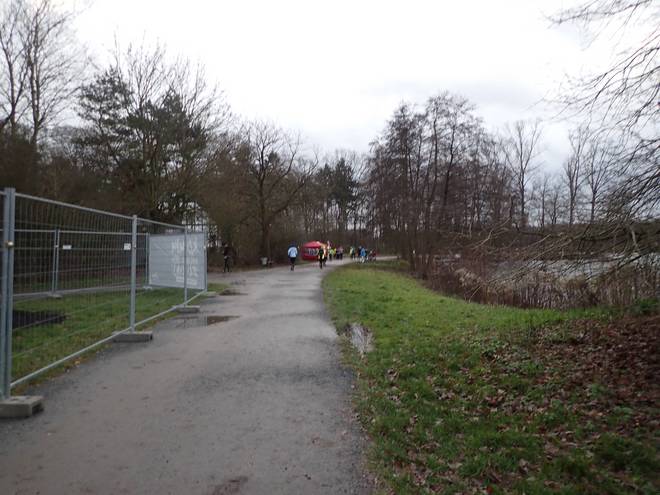 Runde 1 11.01 Uhr / Km 0,2 Wie jedes Jahr waren neun Runden zu laufen. Dabei ging es in der ersten und letzten Runde jeweils nur die 3,095 Kilometer um dem See herum, die Runden 2 bis 8 wurden um eine Zusatzschleife durch den Wald südlich des See ergänzt. Die waren dann jeweils 5,14 Kilometer lang. |