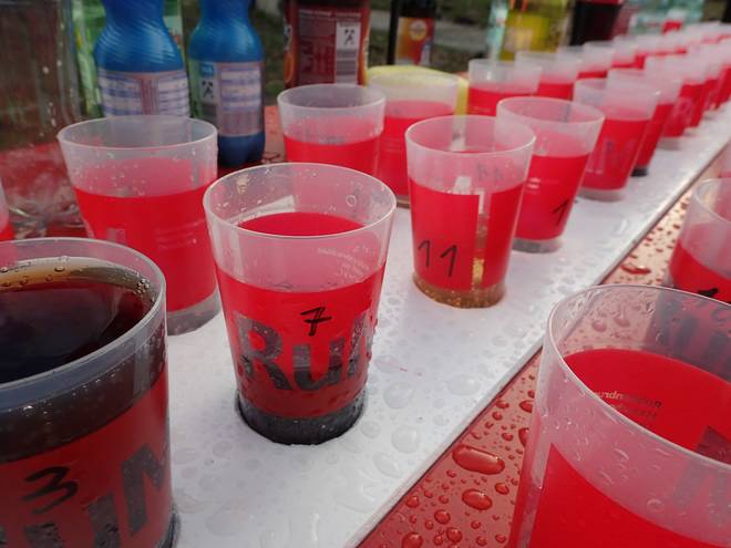Runde 4 13.08 Uhr / Km 18,515 Wie in jedem Jahr waren die Becher am Verpflegungsstand personalisiert. Und wie seit der zweiten Austragung durfte man seinen Becher nach dem Lauf als Souvenir mitnehmen. Ich begann nach der dritten Runde mit dem Trinken und trank ab da jede Runde einen Becher Coca-Cola. |