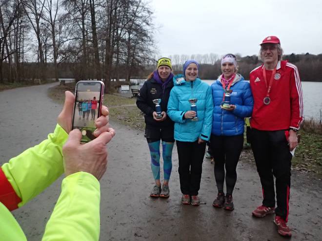 Rubbenbruchsee 16.01 Uhr Die Herrensieger waren wohl schon geduscht zu Hause, aber das Siegertrio der Damen war noch für Fotos da. Susanne, Birgit und Yvonne neben dem Veranstalter Michael. |