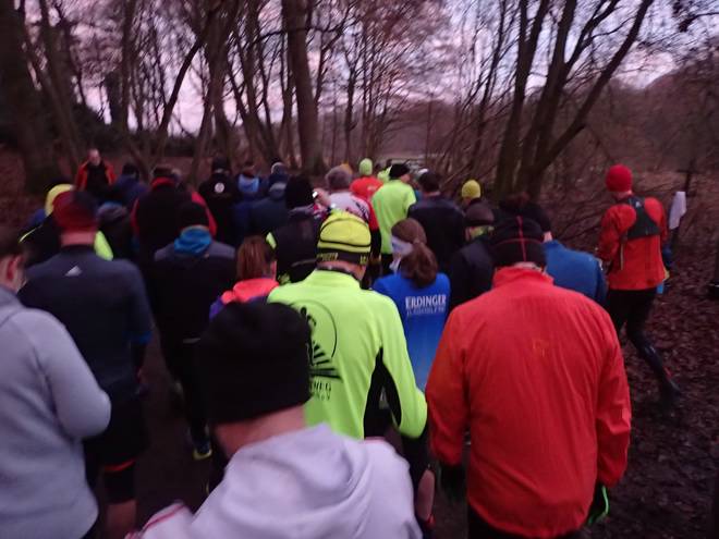 Volksdorfer Teichwiesen 8.28 Uhr 78 Voranmelder gab es. 19 hatten abgesagt und weitere sieben kamen nicht. Blieben noch 52 Läufer für diese imposante Startaufstellung. |