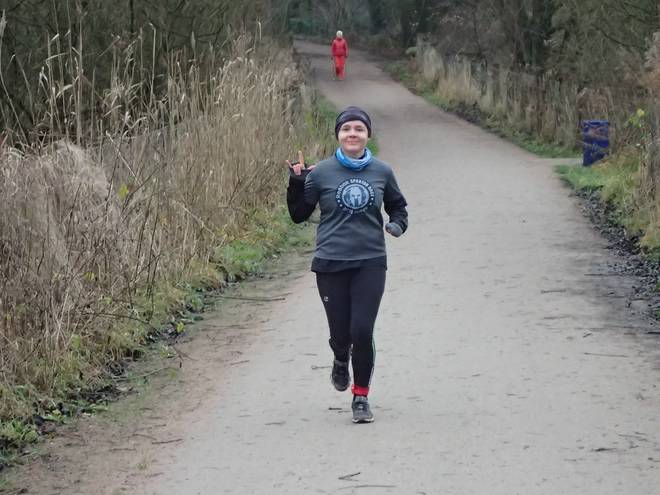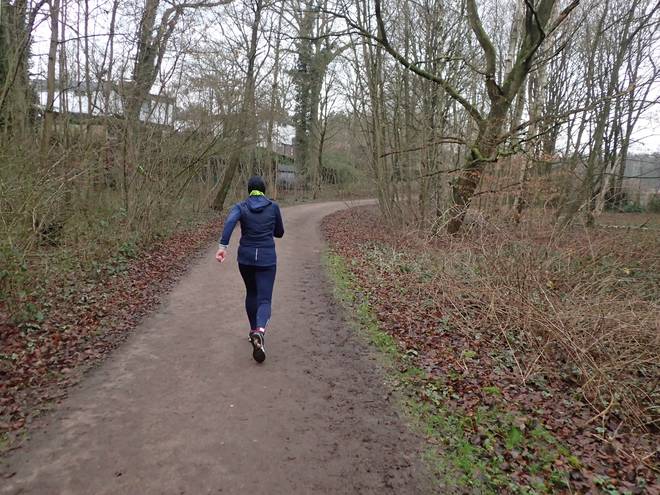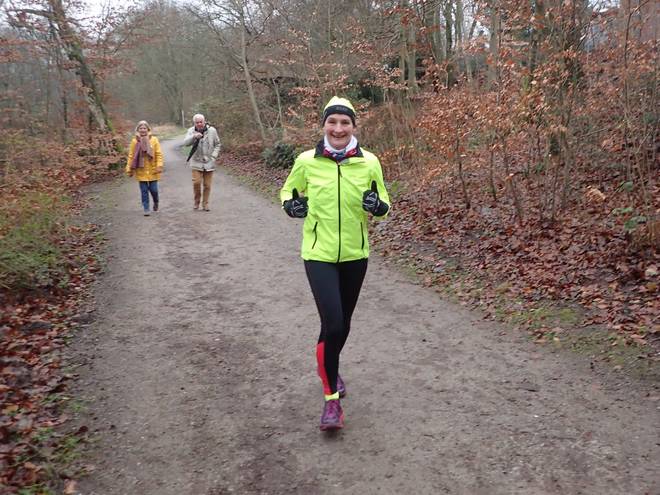 Runde 5 10.14 Uhr / Km 11,1 Irgendwie sieht dieses Foto so aus als würde ich fliegen. So klein ist Linda nun auch nicht. |