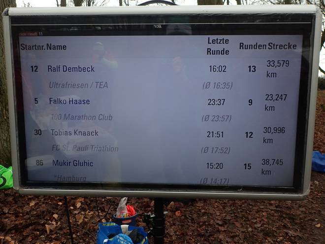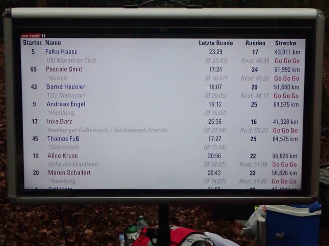 Runde 17 15.13 Uhr / Km 43,911 Gewertet wurden ja nur volle Runden. Gelaufen wurde aber bis zur letzten noch möglichen Runde. Dabei gab bisher öfter mal Streit, wann wer denn noch eine Runde schaffen könnte oder nicht. Schließlich drohte eine Disqualifikation, lief man nicht bis zuletzt. |