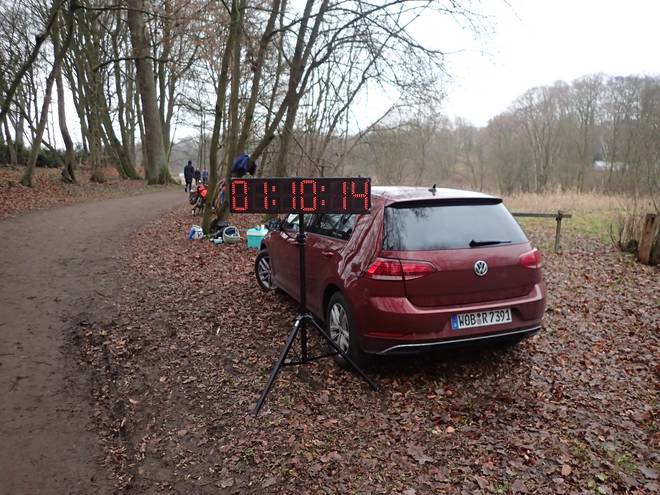 Runde 16 14.49 Uhr / Km 41,328 Aber irgendwie schaffte ich es. Mir fehlte nur das passende Gefühl. 24:06 Minuten für die Runde 16 war ein wenig zu langsam für eine 19. Runde. Aber zur Not hatte ich sicher noch einen Endspurt drauf. Auch wandernd. Die Uhr war inzwischen auf Countdown in Richtung 16.00 Uhr umgestellt werden. Dann war das Rennen vorbei. |