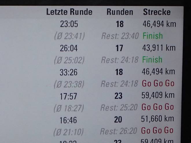 Runde 18 15.36 Uhr / Km 46,494 Runde 18 in 23:05 Minuten. Mit der Zeit waren offenbar Computer und Rennleitung überfordert. |