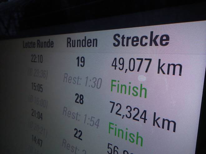 Runde 19 16.00 Uhr / Km 49,077 Pünktlich um 16.00 Uhr sprang die Uhr dann auf Null. Ende. |