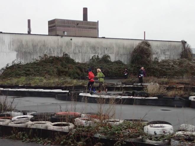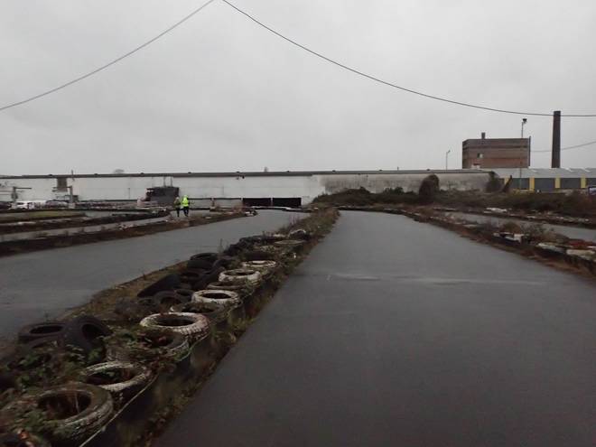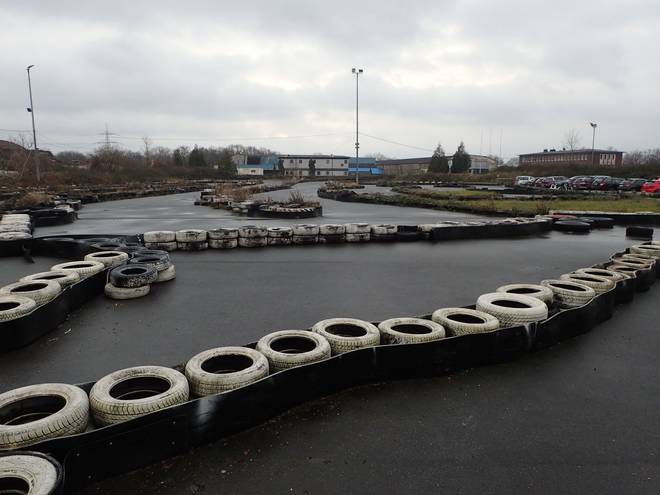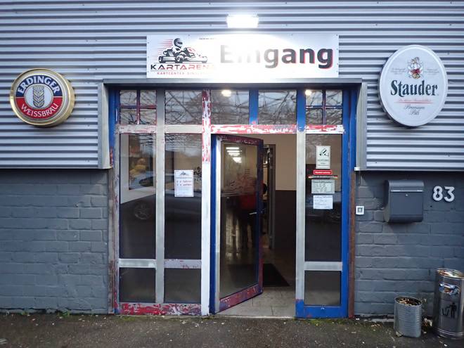 Kartcenter Dinslaken 9.02 Uhr Und der Zugang zur Kartarena hat eine fiese Tücke. Kaum ist man da, muß man noch um den ganzen Block herum wandern. Plus 550 Meter. Nett so für Fußgänger wie mich. |