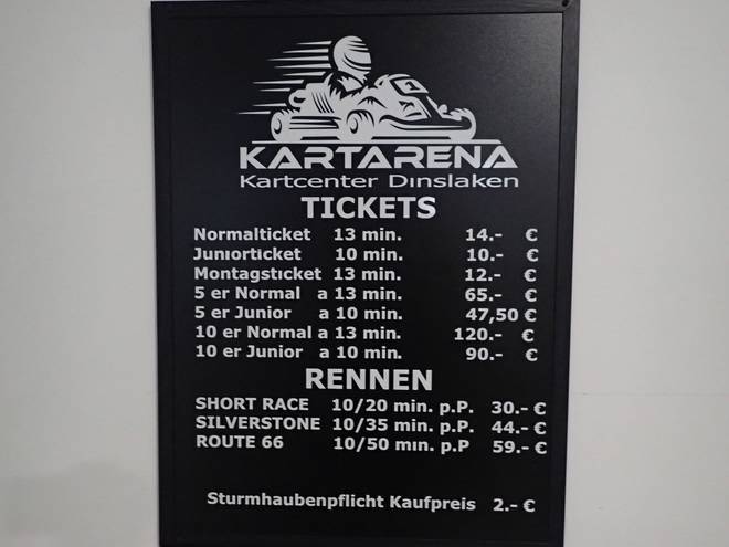 Kartcenter Dinslaken 9.02 Uhr Oh ha. Die Preise hatten es ganz schön in sich. Zum Glück mußte ich für den Lauf nicht pro 13 Minuten bezahlen. |