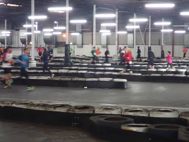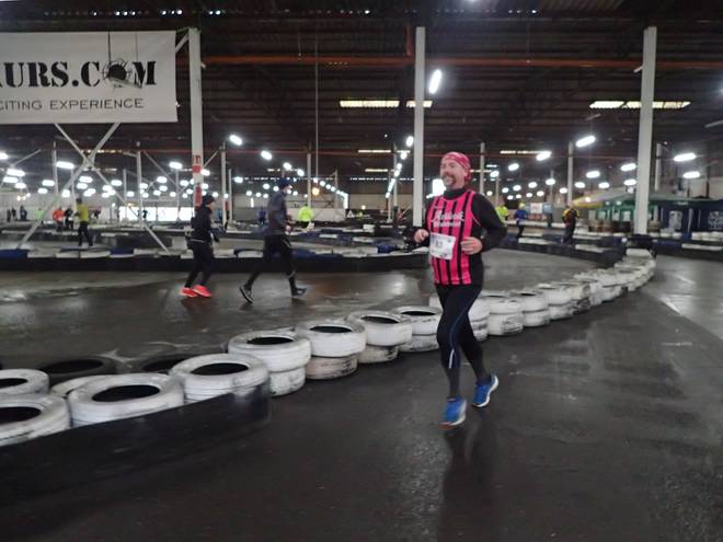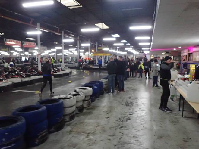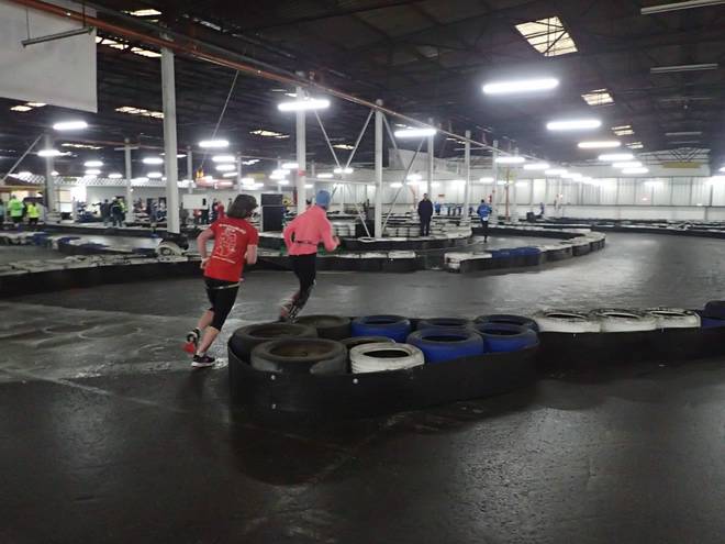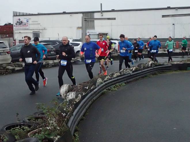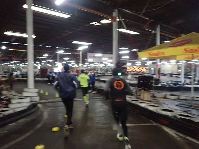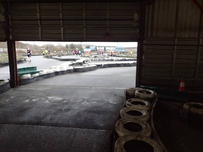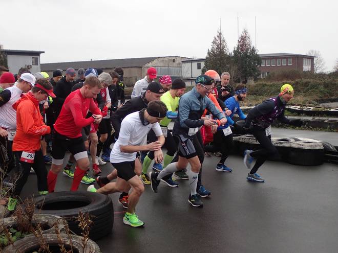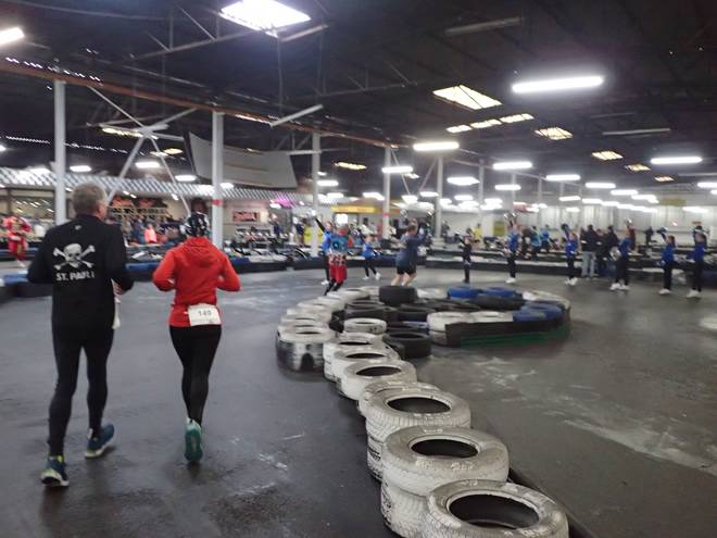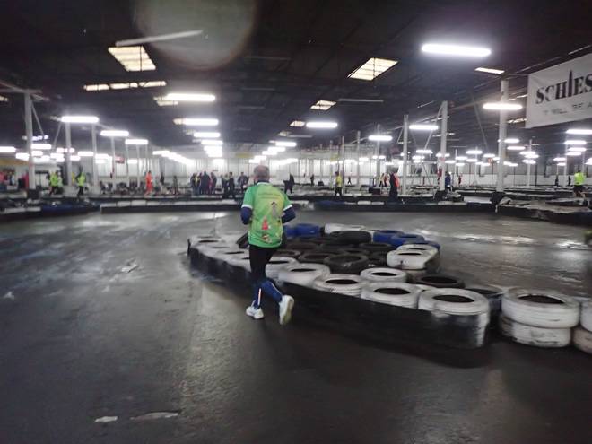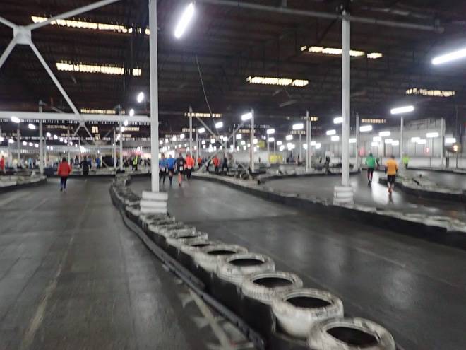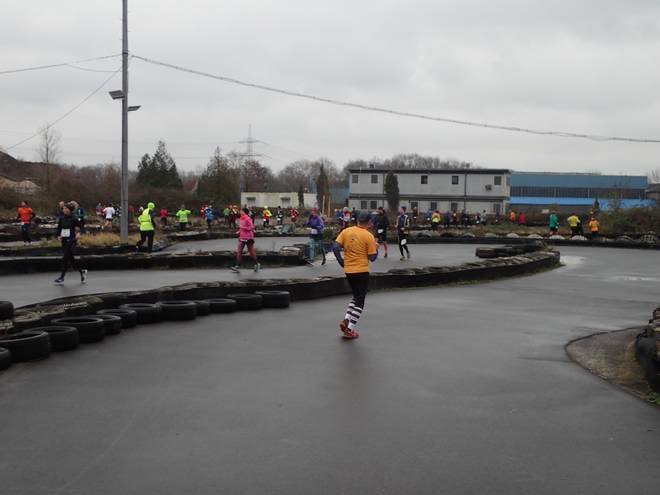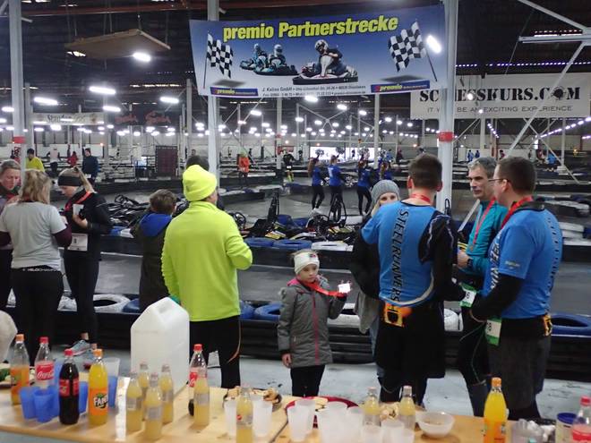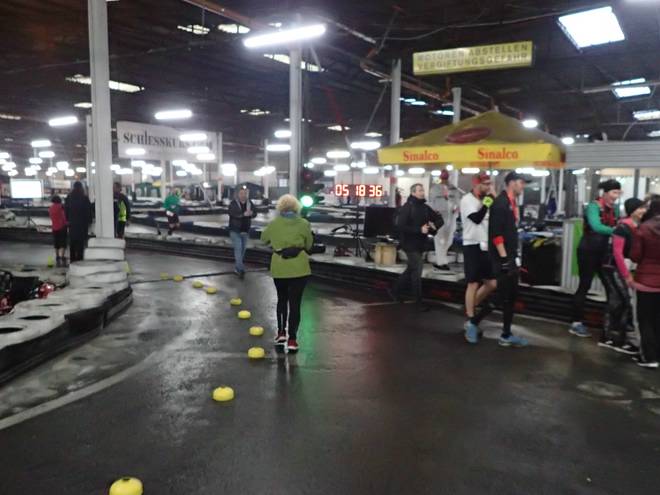 Kartcenter Dinslaken 10.01 Uhr Dann ging es an den Start. Die Halbmarathonläufer starteten in der Halle, die Marathonies mußten nach draußen. |