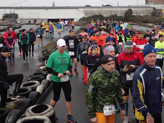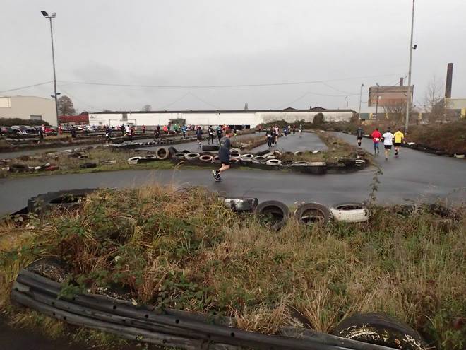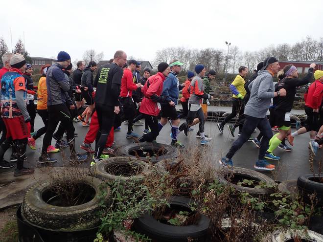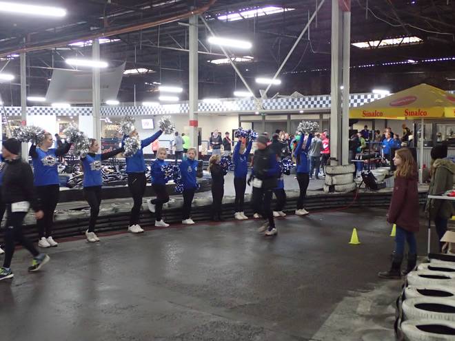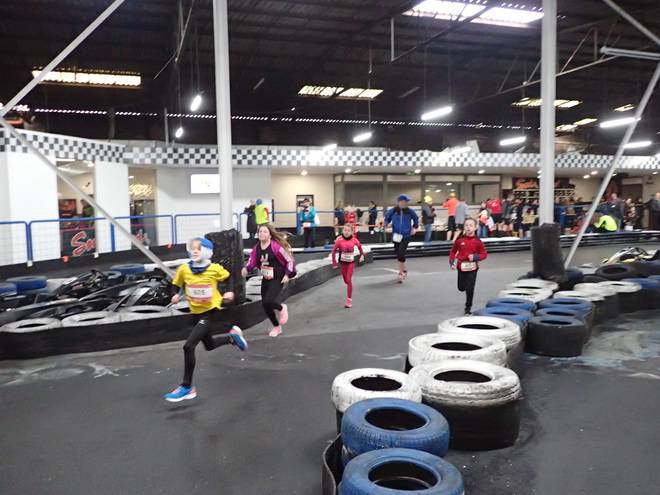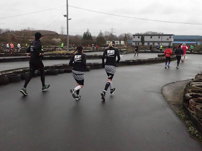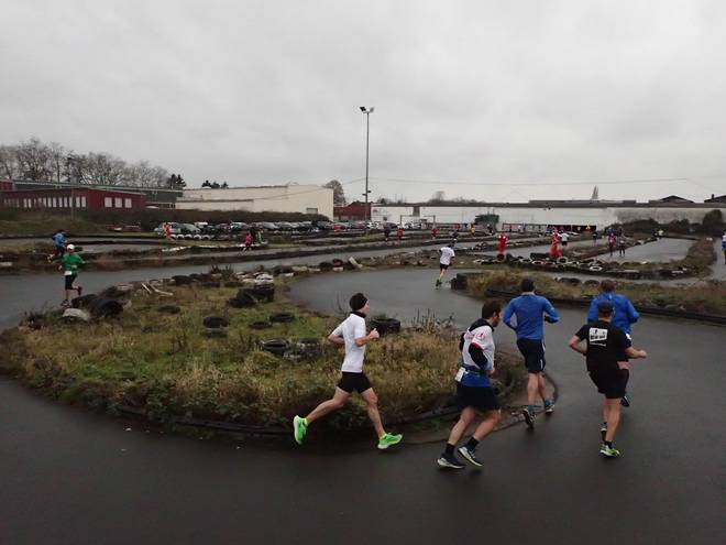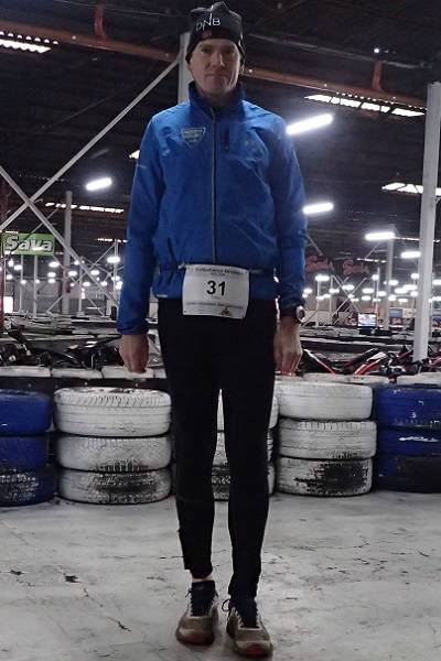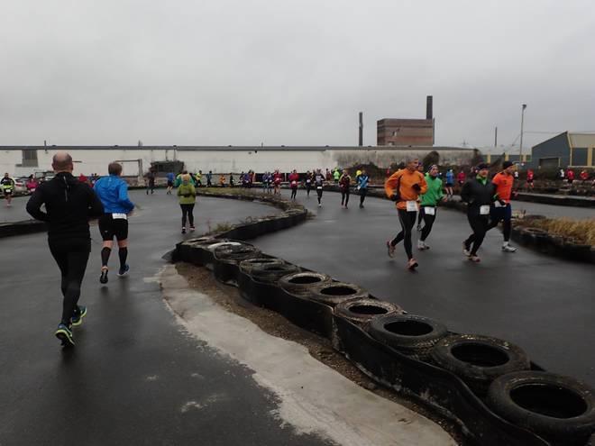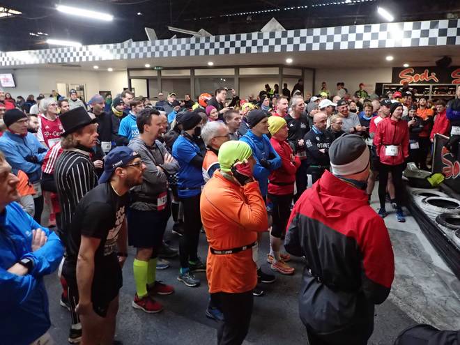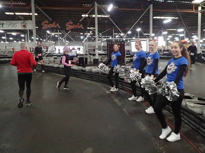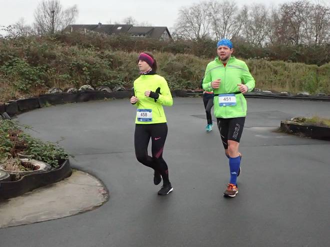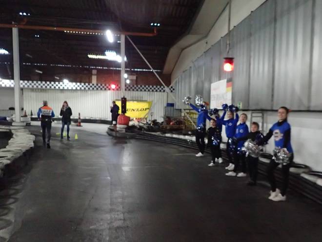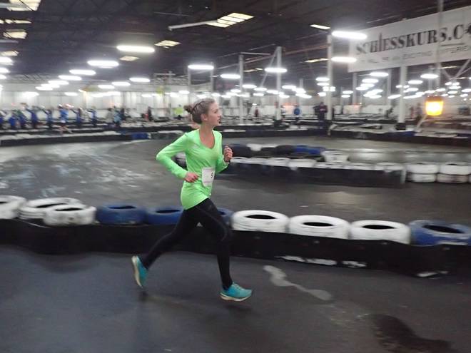 Kartcenter Dinslaken 10.01 Uhr Dann ging es an den Start. Die Halbmarathonläufer starteten in der Halle, die Marathonies mußten nach draußen. |