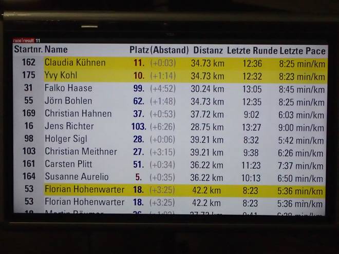 Runde 23 14.24 Uhr / Km 33,6 Immer noch sechs Runden zu laufen. Das zog sich doch ganz schön in die Länge. |