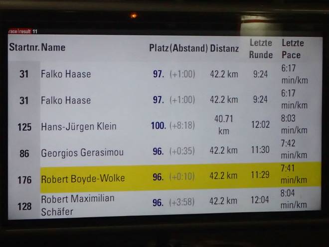 Finish 15.31 Uhr / Km 42,195 9:24 Minuten für meine letzte Runde. 5:28:06 Stunden somit insgesamt. Das war Platz 96 von 103 Männern (die 97 war wohl falsch) , Platz 117 bei 124 Finishern und ganz elegant Letzter der Altersklasse M50. |