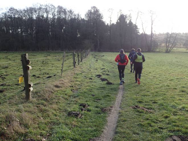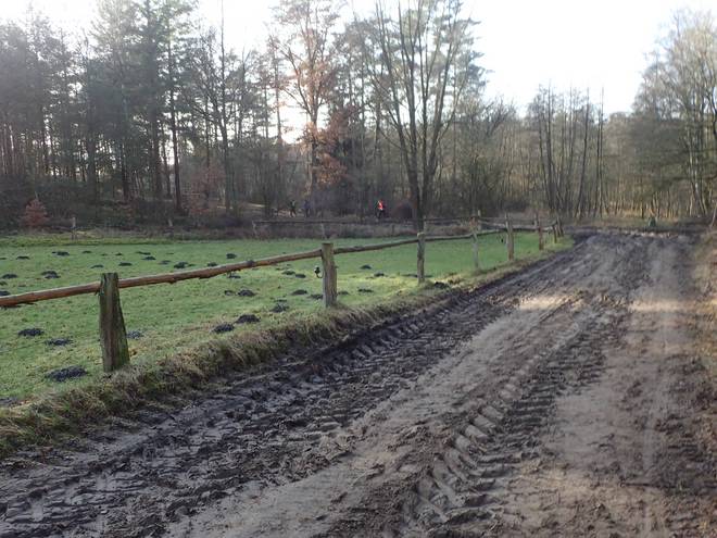 13.34 Uhr / Km 30,2 Hier gab es mehr Matsch, der andere Weg war schmaler und etwas hügeliger. Und wenn der Blick nach links mal offen war, konnte man zur alternativen Strecke rüber blicken. |