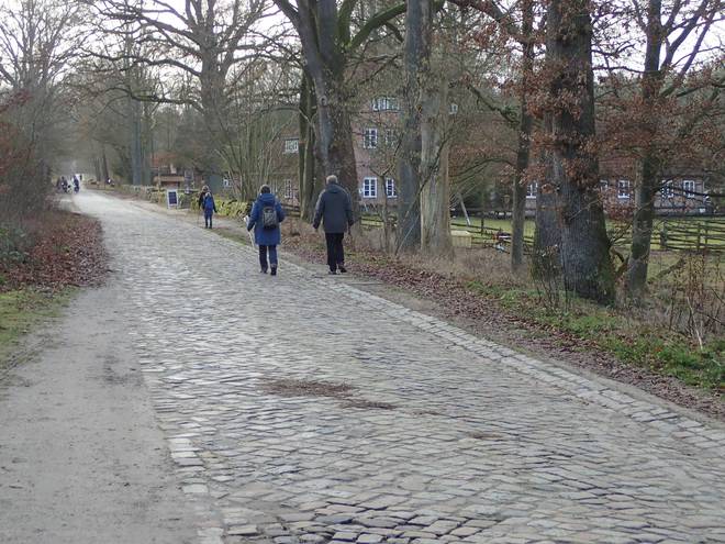 Wilsede 14.17 Uhr / Km 36,5 Dann aber bremste mich das Kopfsteinpflaster aus. Nicht konditionell. Mir schmerzten die Füße bei jedem Schritt. Ein ganz neues Problem. Naja... so wanderte ich eben durch den Ort. |