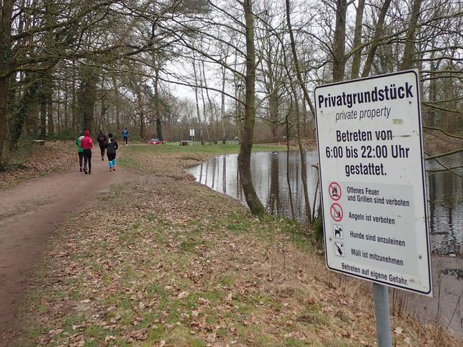 Runde 24 11.57 Uhr / Km 17,2 Der See und das Gebiet drum herum gehört zum Restaurant Sibirien. Damit laufen wir auf Privatbesitz. Aber da man das Gelände eh nicht absperren könnte, wird es eben mit ein paar Einschränkungen für alle geöffnet. |