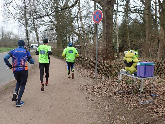 Runde 33 12.38 Uhr / Km 23,8 Ich glaube, der Frosch war schon bei mehr Läufen dabei als ich. |