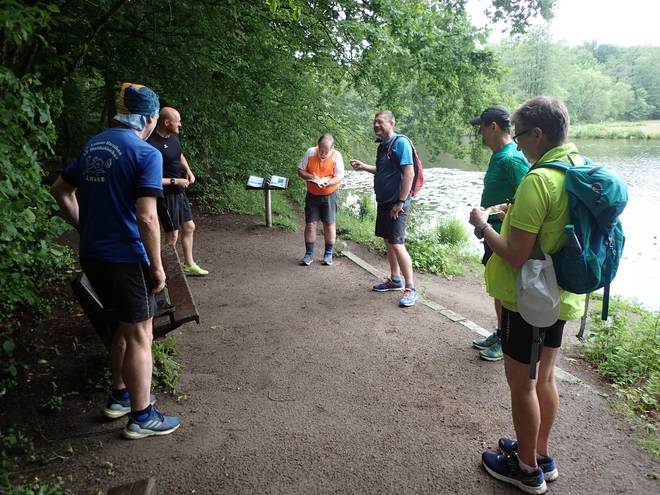 Volksdorfer Teichwiesen 9.08 Uhr Anwesenheitskontrolle nach Corona-Regeln. Wieder gab es keinen Verpflegungsstand und auch keine Ergebnisliste. Da konnte man Organisatorisches auch am See erledigen. Naja... genau genommen ist es kein See, sondern es ist ein Rückhaltebecken des Flusses Saselbek. |