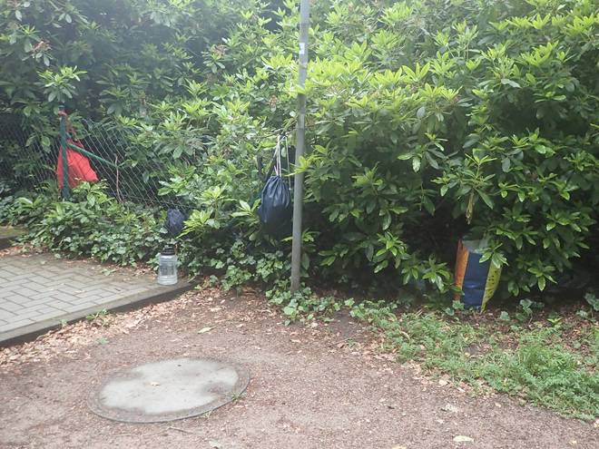 Volksdorfer Teichwiesen 14.20 Uhr Jetzt aber schnell umziehen, so lange es trocken war. Meine Wechselklamotten waren gut eingepackt und wurden auch im Wasserbad Tasche nicht naß. |