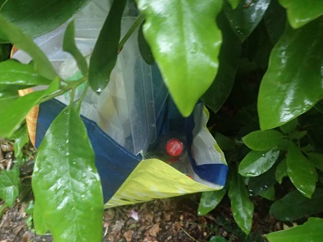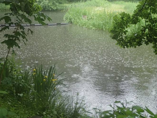 Runde 12 13.07 Uhr / Km 31,863 Nach den Runden 10 und 12 machte ich wieder Trinkpause. Wobei ich nun auch aus meiner Tasche hätte trinken können. Da hatte sich das Wasser gut angesammelt. Aber Coca-Cola war mir dann doch lieber. Der Regenwasser "trank" ich beim Laufen schon genug. |