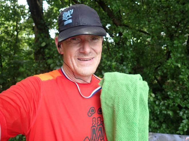 Runde 11 12.47 Uhr / Km 29,0 Das war schön erfrischend. Komplett naß war ich bereits von der Schwüle am Anfang. |