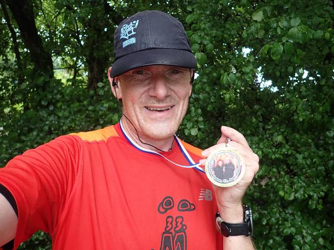 Finish 14.17 Uhr / Km 42,195 Und so sah sie wirklich aus. Wobei sie nicht offiziell war. Vom Veranstalter aus gab es keine Medaillen, also bastelte ich mir wieder mal selbst eine. |