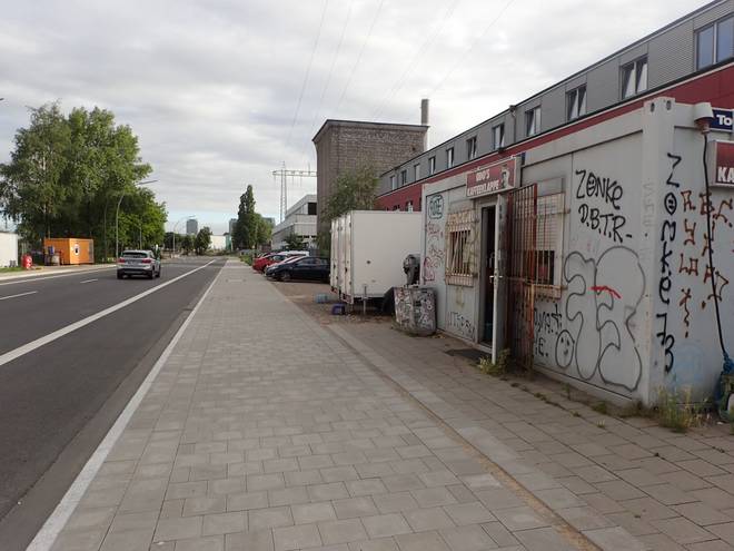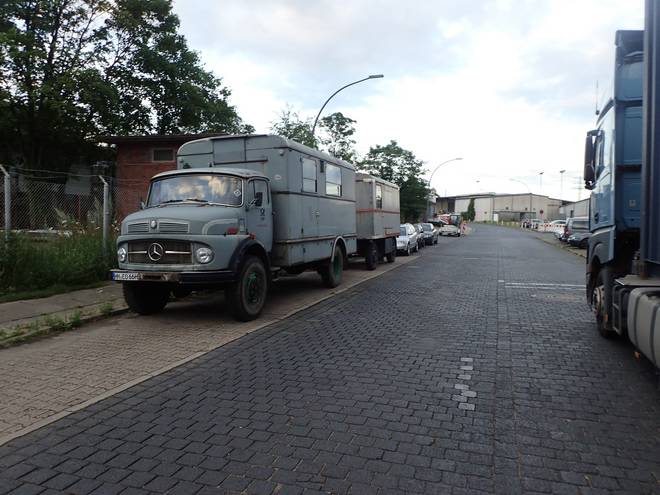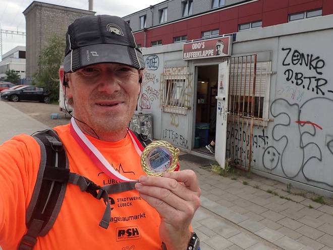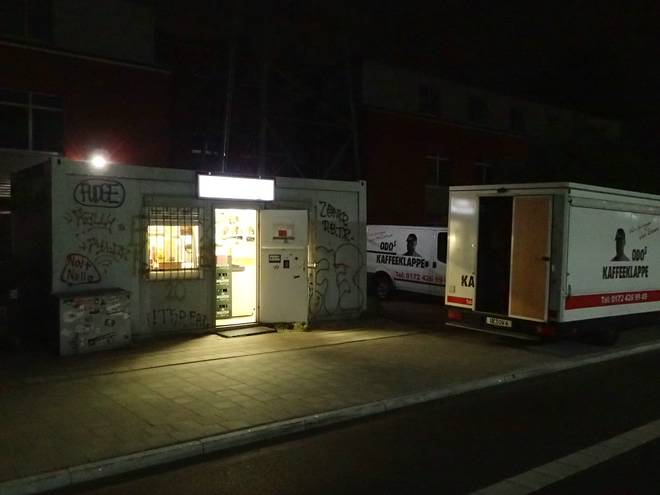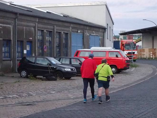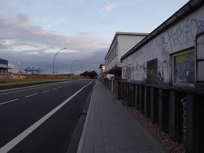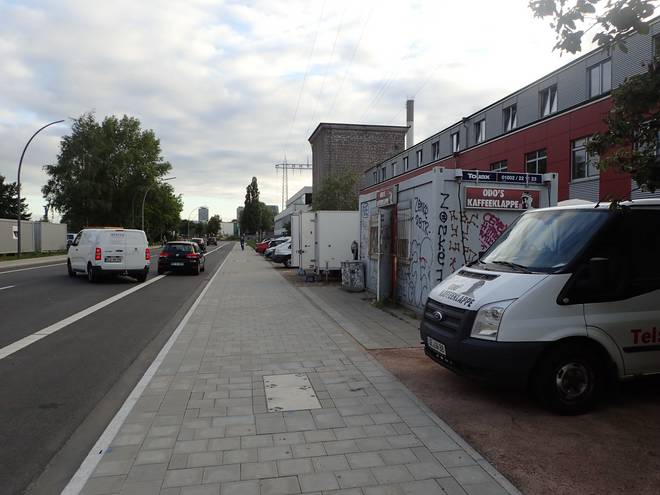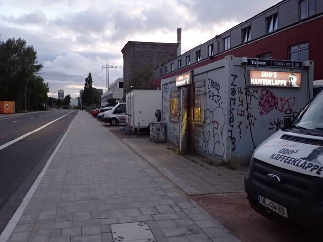 Reiherdamm 2.53 Uhr Odo's Kaffeeklappe steht im Hafen an der Zufahrt zu Blohm + Voss. Außer den Arbeitern dort kommen aber auch viele Fernfahrer zum Frühstücken. Die Öffnungszeit war von 3.00 bis 13.00 Uhr (Stand Juli 2020). Daraus ergaben sich Startzeit und Zeitlimit für den Lauf. |