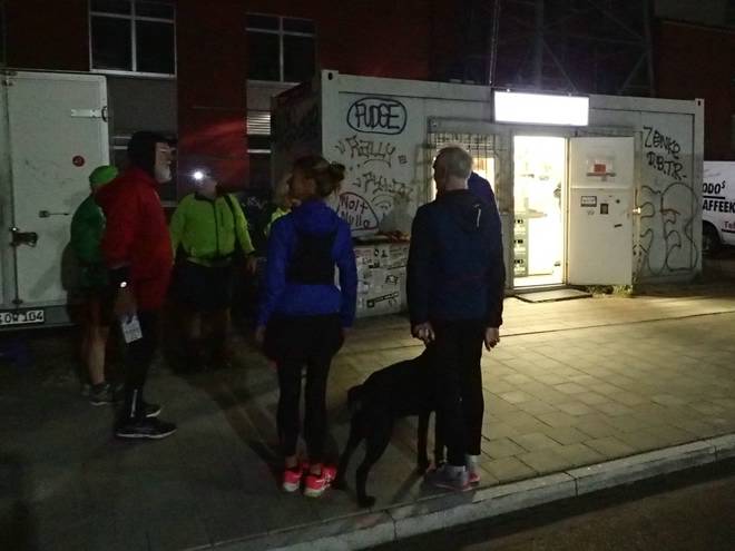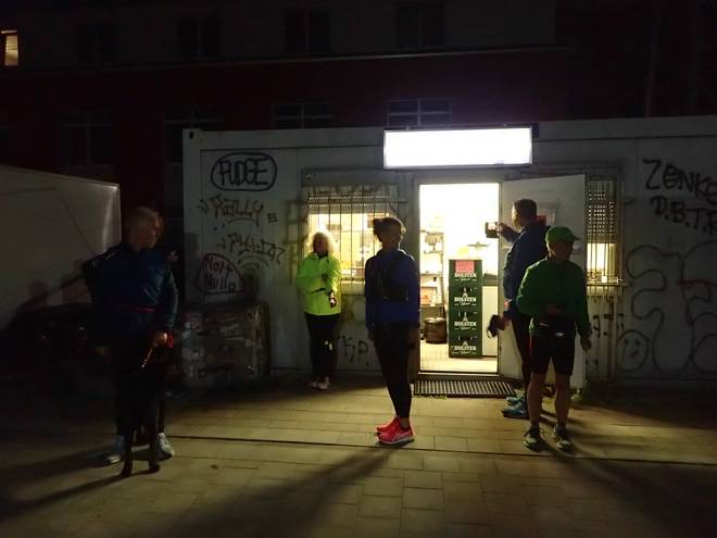 Reiherdamm Runde 8 5.43 Uhr / Km 22,7 Endlich hatte ich Christine eingeholt. Praktischerweise kurz vor Ende der Runde. Da konnte ich mir meine Tasche direkt geben lassen. |
