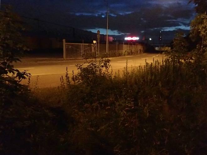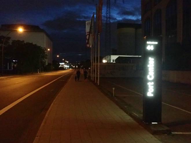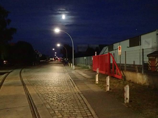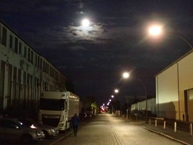 Ellerholzdamm Runde 2 3.40 Uhr / Km 4,5 Der Mond sah hübsch aus, die Strecke war aber durchgehend beleuchtet, so diente er eher dekorativen Zwecken. |