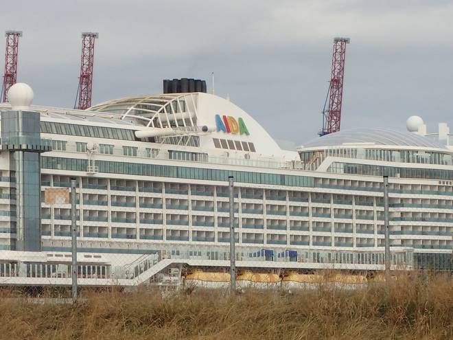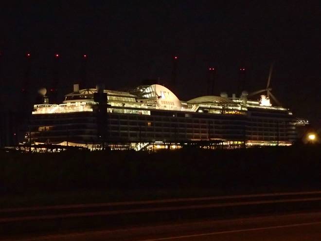 Reiherdamm Runde 1 3.27 Uhr / Km 2,8 Eines der AIDA-Schiffe lag gerade bei Blohm + Voss im Dock. |