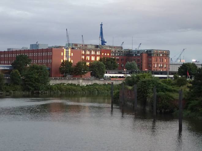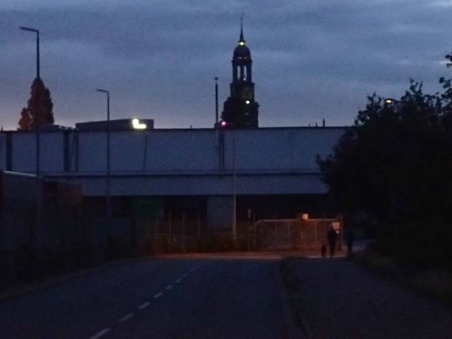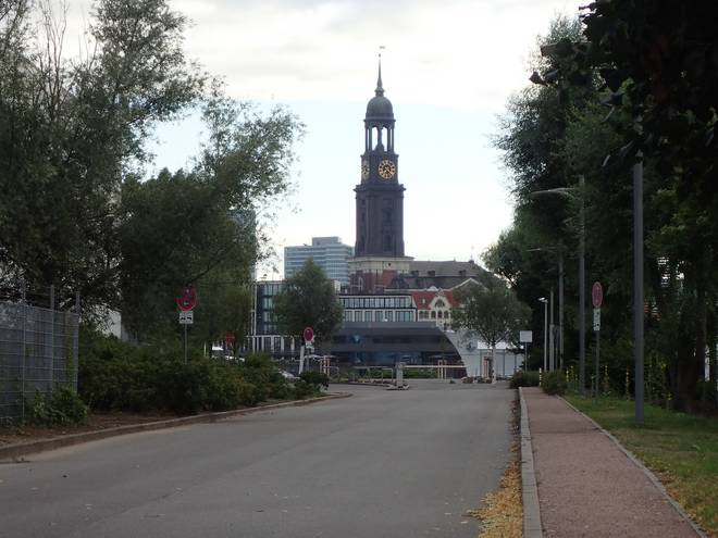 Nordersand Runde 14 7.22 Uhr / Km 37,5 Blick Richtung der Parkplätze neben den Musical-Theatern. Dahinter die Hauptkirche St. Michaelis. Da ist allerdings noch die Elbe dazwischen. |