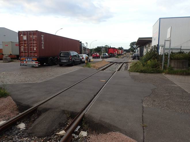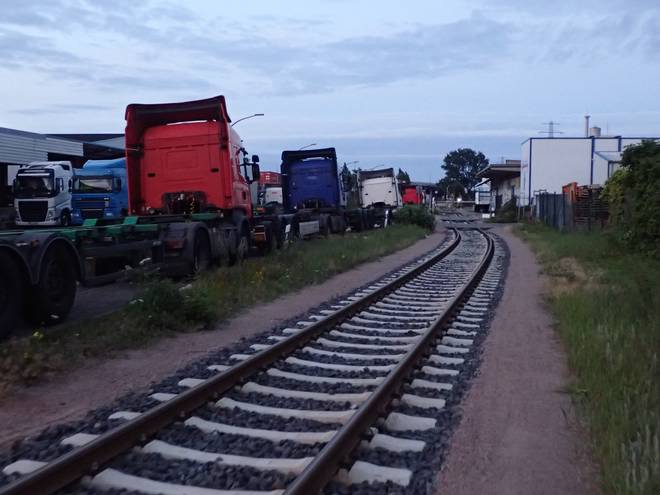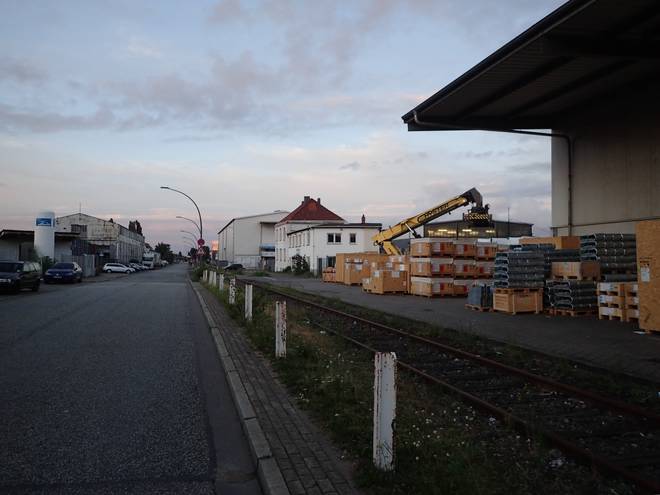 Ellerholzdamm Runde 5 4.41 Uhr / Km 13,4 Inzwischen hatte den meiner Meinung nach besten Weg durch die LKW gefunden. Da nutzte ich auch diesen Weg neben den Schienen (fährt hier eigentlich die Hafenbahn???). Der war allemal ebener als das Kopfsteinpflaster der Straße. Und verkehrsärmer... |