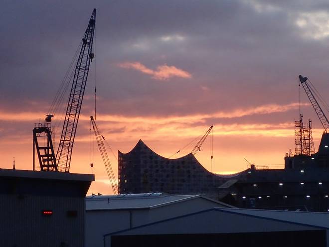 Reiherdamm Runde 6 5.06 Uhr / Km 17,2 Um 5.02 Uhr war offizieller Sonnenaufgang. Wegen der Wolken war die Sonne selbst nicht zu sehen, aber das hinter Elbphilharmonie sah auch so toll aus. |