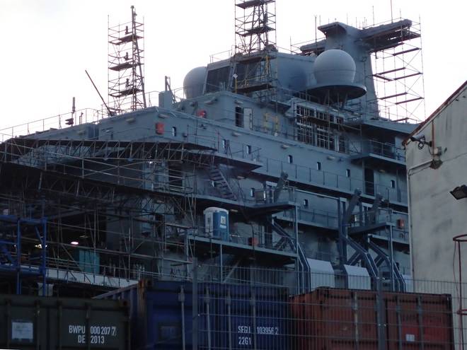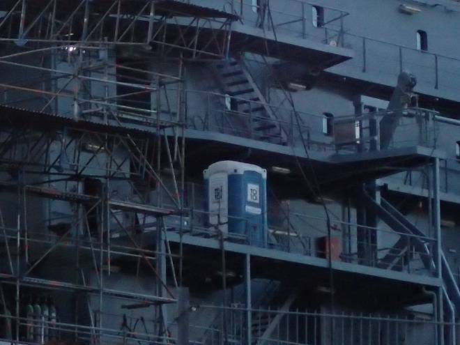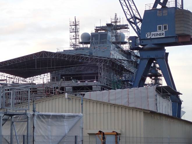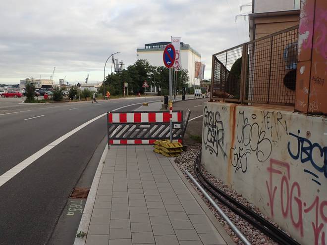 Ellerholzdamm Runde 8 5.33 Uhr / Km 21,1 Blohm + Voss ist nicht die einzige Werft am Kurs. Hier schien sich ein Marine-Schiff im Bau zu befinden. |